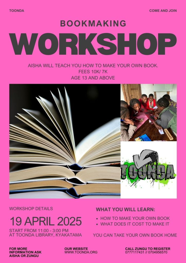 On Saturday 19th of April Aisha will also offer a bookmaking workshop at our library with fees of 10k/ 7k to cover the costs of materials.